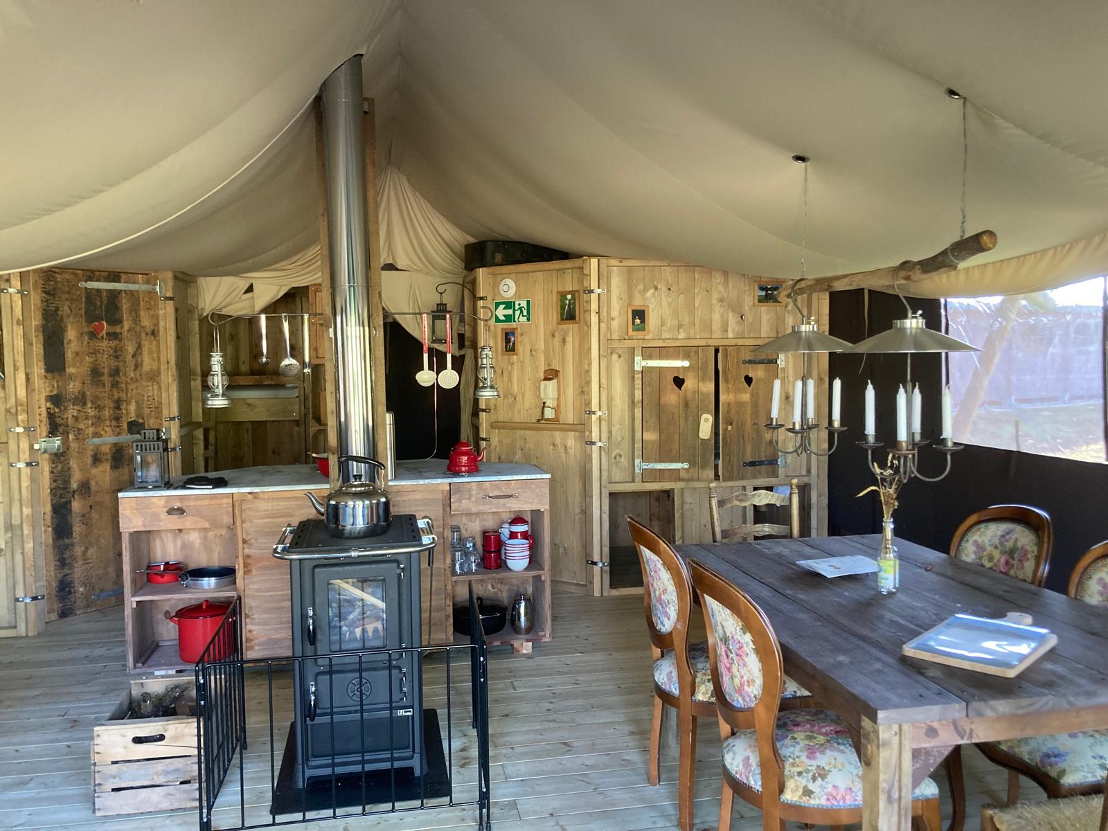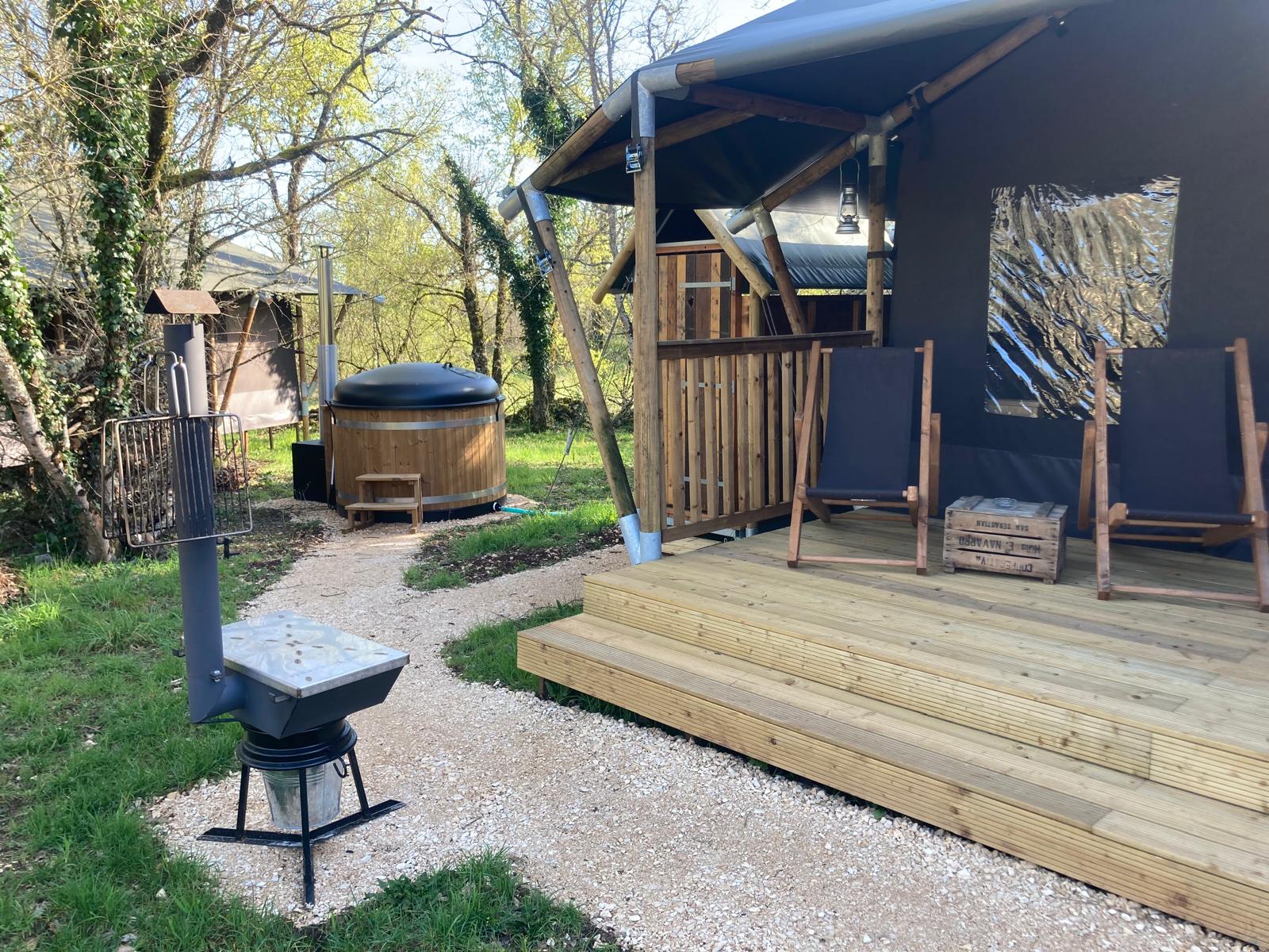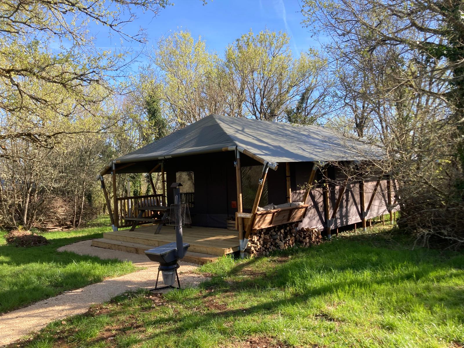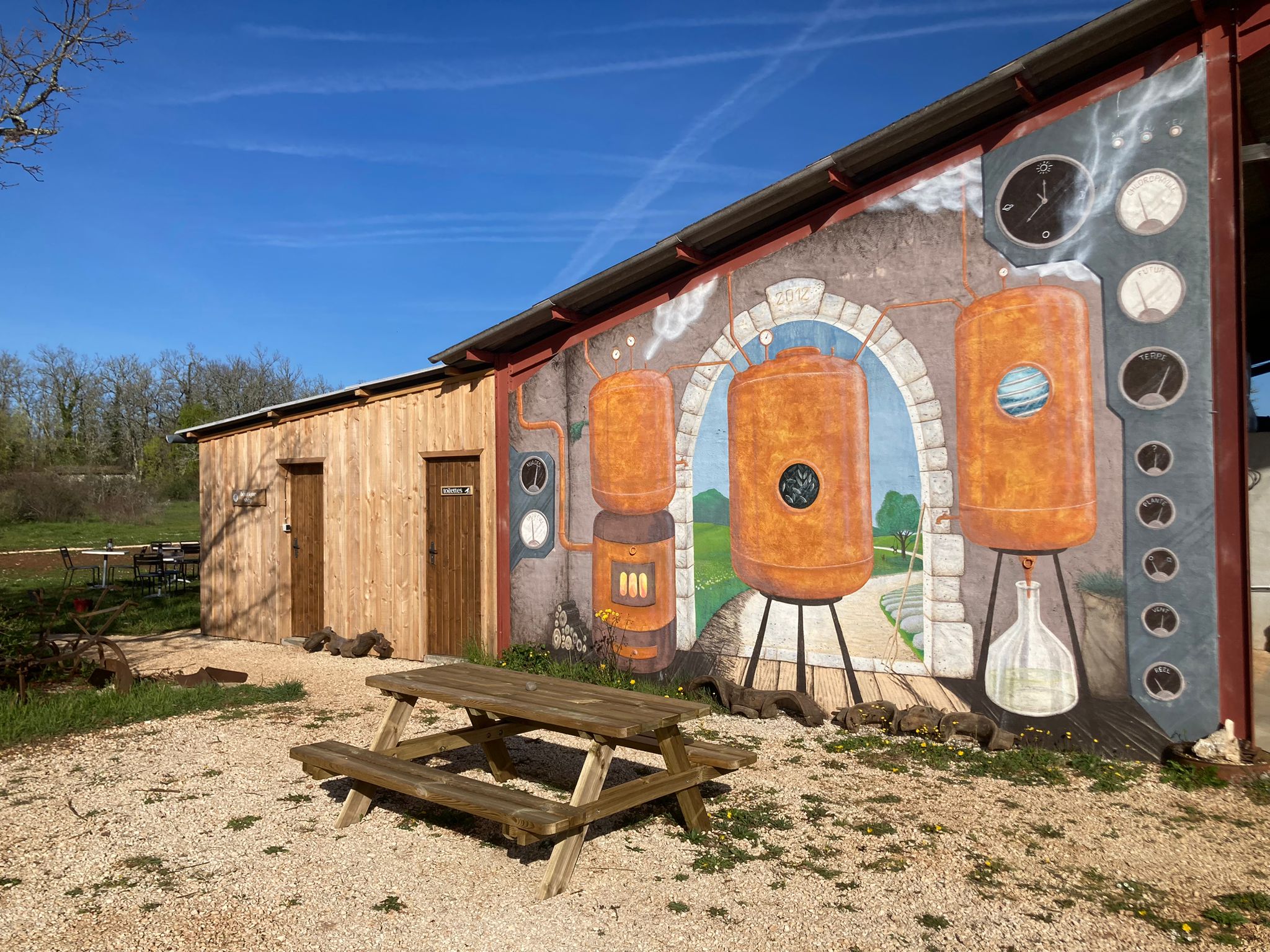 Cinq lodges en bois et toile, nichés parmi les vieux murets en pierres sèches typiques du Quercy. Ensemble, ils forment un petit éco-village boisé, à quelques pas de la distillerie et des prairies. Chaque lodge dispose de son bain nordique privé et de sa douche individuelle, le confort est là, mais l’électricité, non. Et c’est tout l’intérêt.